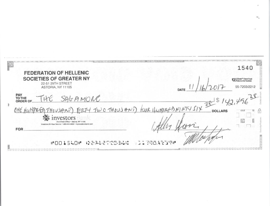 Στις 11/16/17 ο τότε Πρόεδρος και ο τότε ταμίας της Ομοσπονδίας εξέδωσαν μια επιταγή για $142,000 προς το the Sagamore. (βλέπε check)