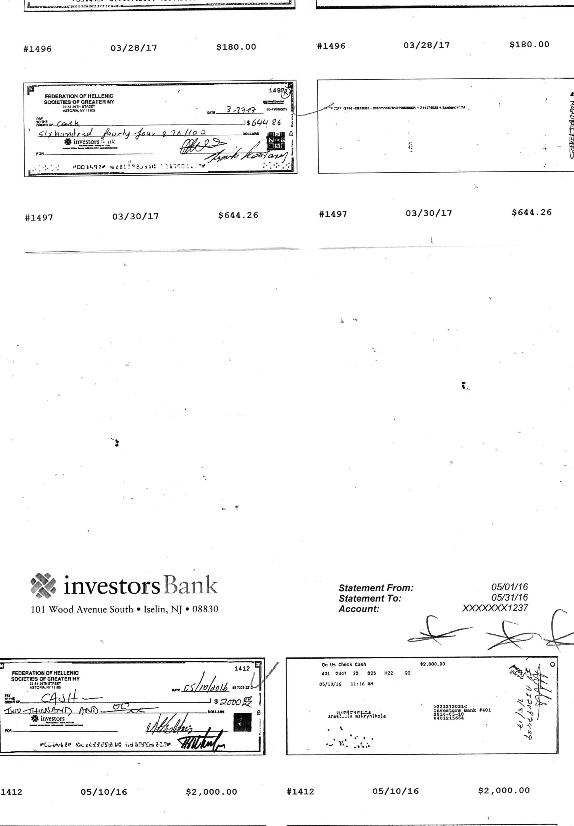 Υπάρχουν πολλά στοιχεία που δεν δικαιολογούνται και δείχνουν αποστολή χρημάτων μέσω τραπέζης σε διάφορους παραλήπτες στην Ελλάδα. Μεταξύ αυτών συγκαταλέγονται εταιρεία λογισμικού και τεχνολογικών υπηρεσιών στο Αργοστόλι για $13,694. Επιτροπή για την ανακαίνιση του Ναού του Αγ. Νικολάου στο χωριό Αγία Θέκλη για $27,013.Σε κάποια οργάνωση που ονομάζεται Πανελλήνια Ομοσπονδία PO για $9,950. Δυο εμβάσματα σε ιδιώτες στη Χίο με το αιτιολογικό «επισκευή αστυνομικού οχήματος για τα ποσά $1,803.83 και $1,683.93. Σε κάποιον οργανισμό που αναφέρεται ως GEETHA για $14,950.01. Υπάρχουν ακόμη επιταγές πληρωτέες σε μετρητά CASH, πληρωμή $9,855 σε εταιρεία λογιστικού λογισμικού χωρίς ποτέ να υπήρξε ή να χρησιμοποιήθηκε τέτοιο λογισμικό από την Ομοσπονδία, αυθαίρετες εκταμιεύσεις σε φιλανθρωπικές οργανώσεις, πληρωμές που χαρακτηρίζονται ως «επιστροφές πιστωτικών καρτών» και άλλα.