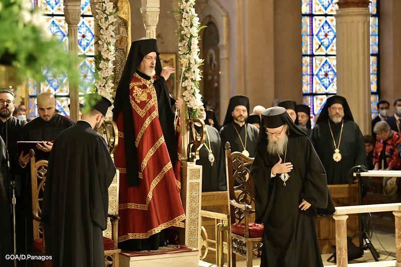 Συμπροσευχόμενος παρέστη και ο Αρχιεπίσκοπος πρώην Αμερικής, κ. Δημήτριος, τον οποίο ο Αρχιεπίσκοπος κ. Ελπιδοφόρος κάλεσε για την αναμνηστική φωτογραφία. “Σεβασμιώτατε, Please, join us.  Έχετε δικαιώματα εδώ”, είπε με χαμόγελο ο Οικουμενικός Πατριάρχης, κ. Βαρθολομαίος στον Αρχιεπίσκοπο Δημήτριο.
