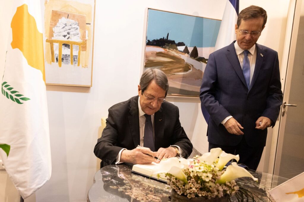 Ο Πρόεδρος Αναστασιάδης μετέβη το πρωί στο Προεδρικό Μέγαρο, συνοδευόμενος από τα μέλη της κυπριακής αντιπροσωπείας, όπου τον υποδέχθηκε ο νέος Πρόεδρος του Ισραήλ, με τον οποίον παρακάθισαν σε κατ΄ιδίαν συνάντηση, την οποία ακολούθησαν διευρυμένες συνομιλίες μεταξύ των δύο πλευρών.