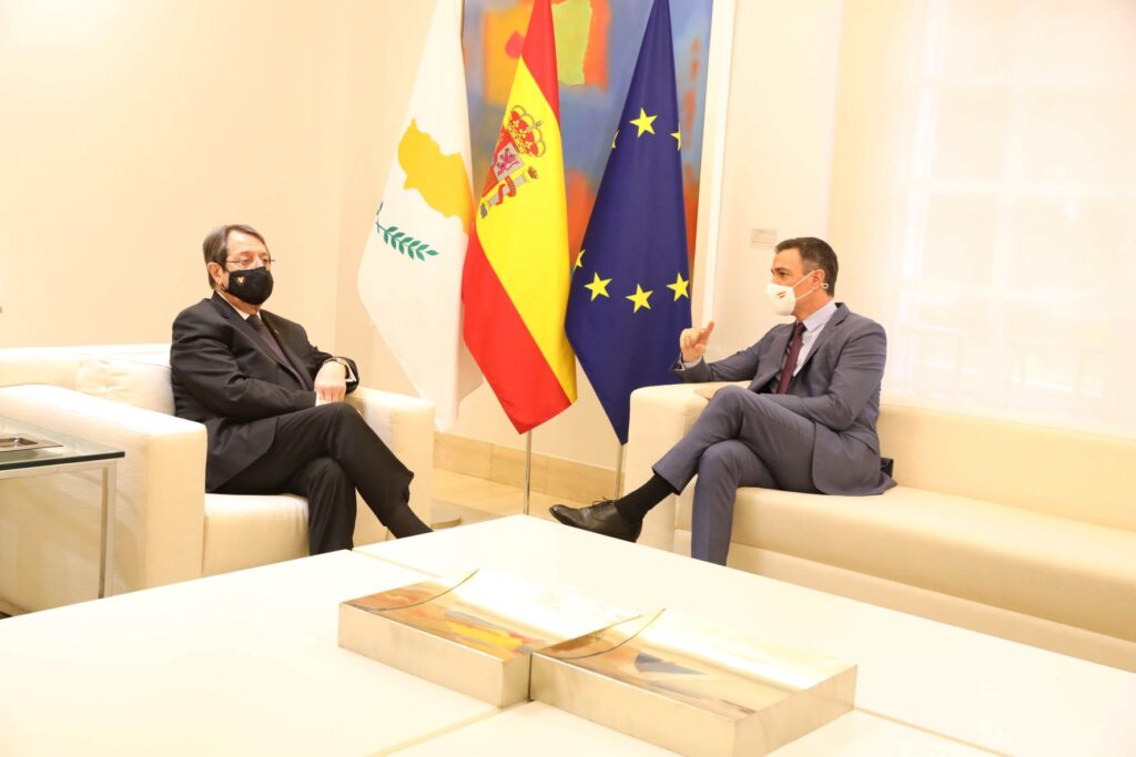 Με τον Πρωθυπουργό της Ισπανίας Πέδρο Σάντσεθ συναντήθηκε το πρωί σήμερα στο Πρωθυπουργικό Μέγαρο Moncloa στη Μαδρίτη ο Πρόεδρος της Κυπριακής Δημοκρατίας, Νίκος Αναστασιάδης στο πλαίσιο της μονοήμερης επίσκεψης που πραγματοποιεί στην Ισπανία.