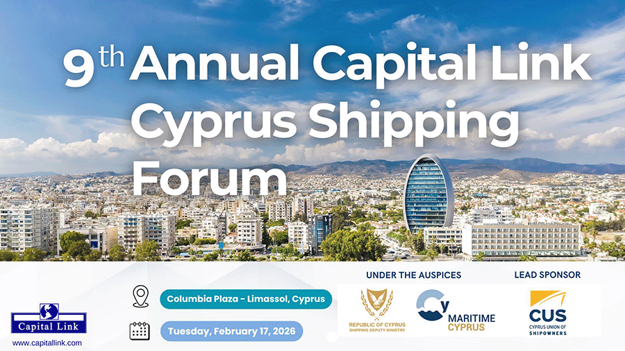 Capital Link will host the 9th Annual “Cyprus Shipping Forum” on Tuesday, February 17, at the Columbia Plaza in Limassol, bringing together leading figures from Cyprus’ maritime, energy, and diplomatic sectors. The Forum is held under the auspices of the Shipping Deputy Ministry and the Shipping Deputy Minister to the President, in cooperation with the Cyprus Union of Shipowners, which serves as Lead Sponsor. The Cyprus Shipping Chamber and other major stakeholders of the island’s maritime cluster are also supporting the event.