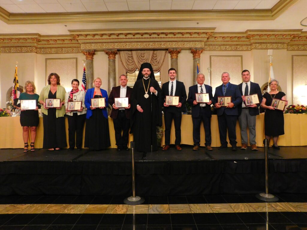 Nearly 100 faithful from the 13 parishes of Maryland and Northern Virginia were honored by His Eminence Metropolitan Apostolos of New Jersey for their exemplary commitment and self-sacrifice to their parishes. Honorees were recognized in eight categories: Senior Steward, Philoptochos, Parish Council, Community, Religious Educator, Church Musician, Youth Advisors, and GOYAns. Each received a wooden plaque inscribed with their name and adorned with an icon of St. Iakovos of Evia, the new patron saint of the Metropolis of New Jersey.