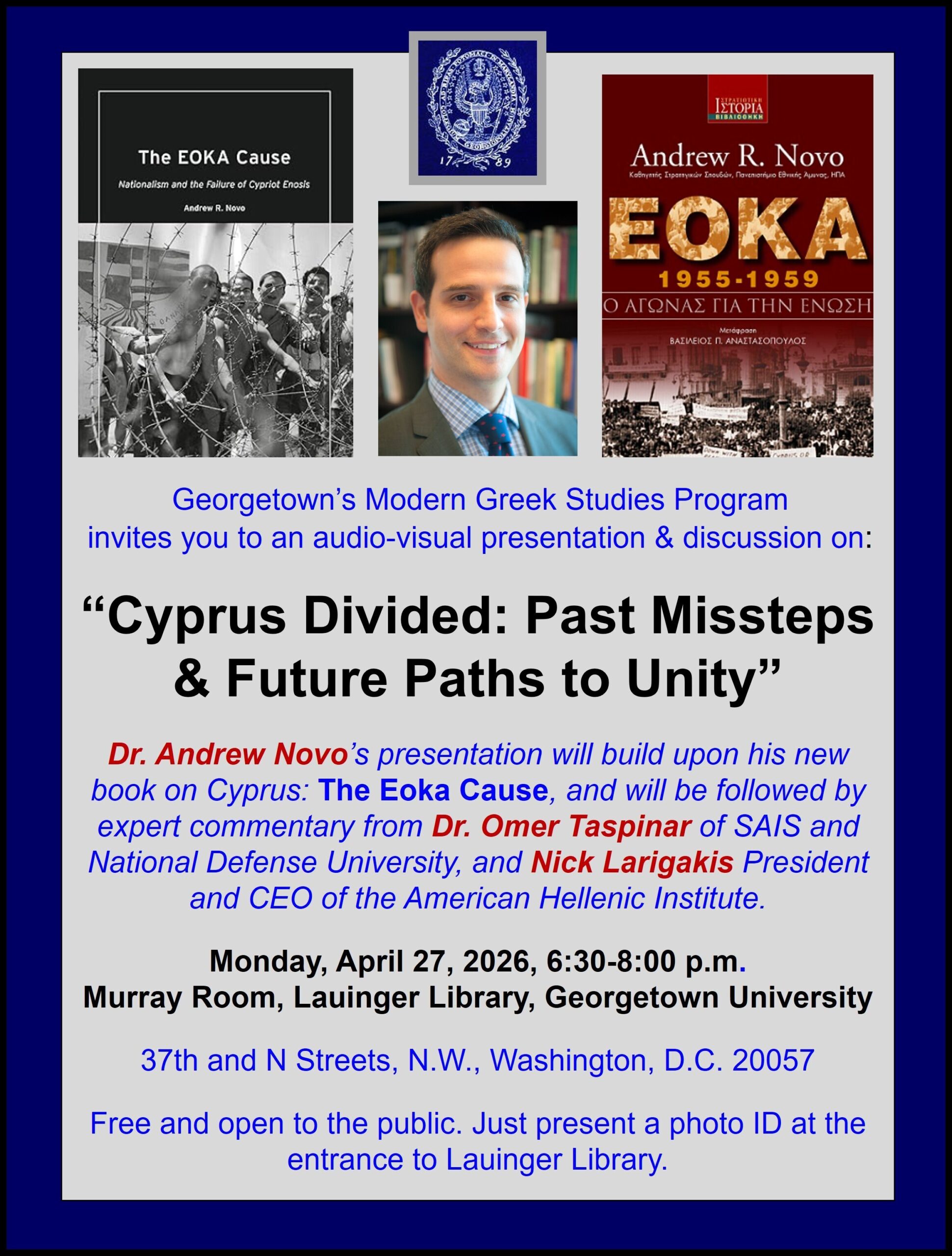 Georgetown’s Modern Greek Studies Program hosts an audiovisual presentation and discussion titled “Cyprus Divided: Past Missteps & Future Paths to Unity” with Dr. Andrew Novo who will offer an in-depth look at his new book on “Cyprus: The EOKA Cause: Nationalism and the Failure of Cypriot Enosis”.