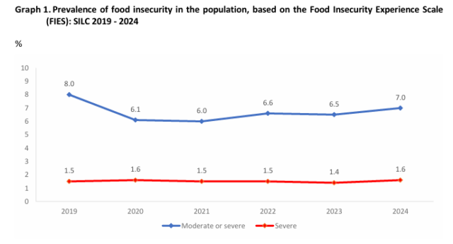 Seven percent of the total population of Greece experienced moderate or severe levels of food insecurity, based on the results of the 2024 Survey on Income and Living Conditions of Households (EU-SILC), with income reference period the year 2023, released by the Hellenic Statistical Authority (ELSTAT) on October 7.