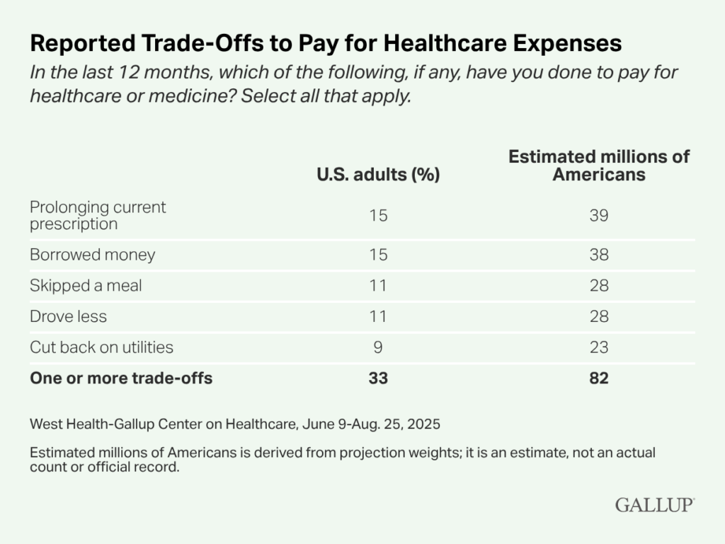 Η έρευνα, που διεξήχθη το 2025 σε 20.000 άτομα από το West Health-Gallup Center, εκτιμά ότι περισσότεροι από 82 εκατομμύρια ενήλικες Αμερικανοί επέλεξαν τουλάχιστον ένα από αυτά τα μέτρα για να πληρώσουν τους λογαριασμούς υγειονομικής περίθαλψης, οι οποίοι είναι ιδιαίτερα υψηλοί στις Ηνωμένες Πολιτείες σε σύγκριση με άλλες ανεπτυγμένες χώρες.