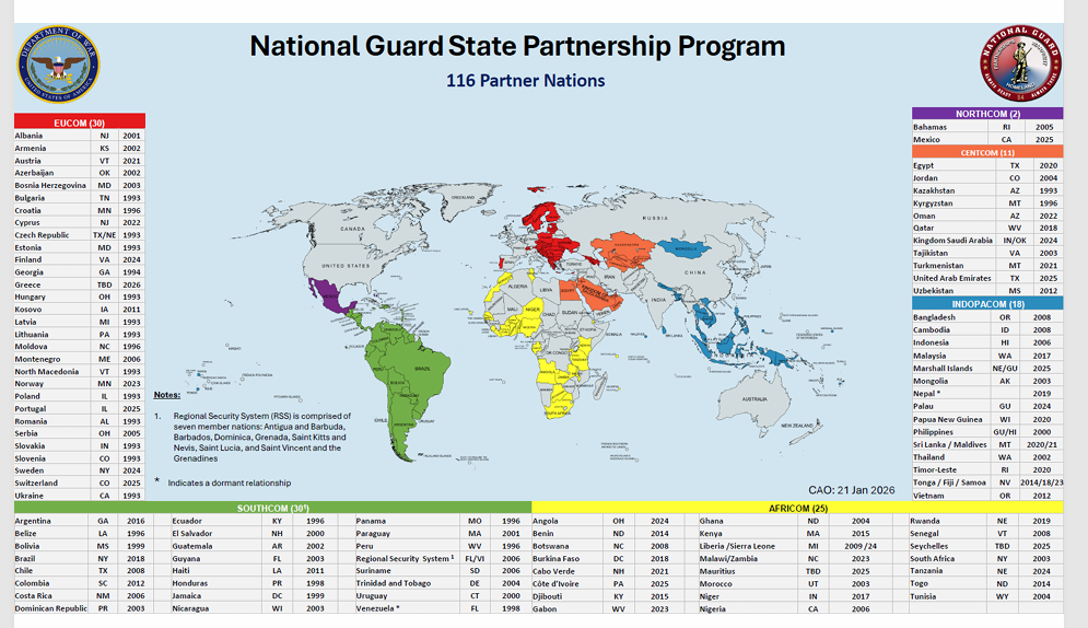 On a map published on the website of the U.S. National Guard, Greece now appears highlighted in red and marked “TBD.” The technical designation signals Athens’ entry into the U.S. State Partnership Program (SPP), a long-standing initiative that pairs the National Guard of individual U.S. states with foreign armed forces to develop long term defense cooperation.