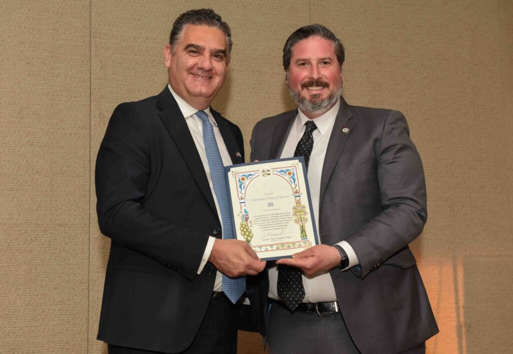 During the reception, the Mayor of Glendale, Ardy Kassakhian [photo], presented to the Consul General of Greece in Los Angeles, Ioannis Stamatekos, a proclamation on behalf of the City of Glendale, CA, honoring the National Day of Greece.