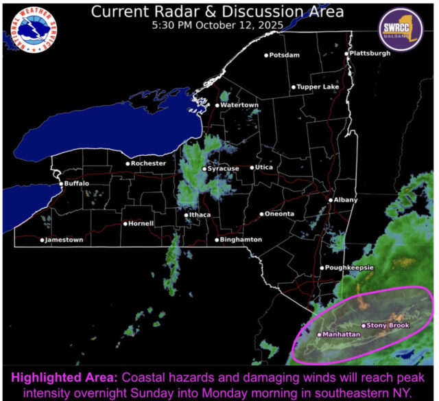 The threat for coastal flooding has increased as the storm has moved up the coast and the National Weather Service now has Coastal Flood Warnings in place for Long Island, New York City and Southern Westchester County beginning 12 p.m. Sunday through 8 p.m. Monday. Forecasts are calling for widespread moderate to major coastal flooding for the south shore bays of Nassau and southwestern Suffolk counties during times of high tide until Monday. Widespread minor to moderate coastal flooding remains a threat for the remainder of the coastline, with the widespread possibility of dune erosion and localized overwashes along the Atlantic Ocean beaches.