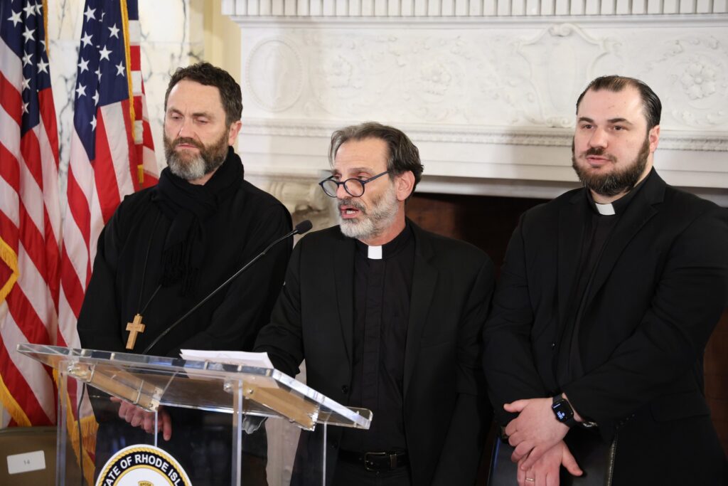 Following the ceremonies in the Senate and House chambers, as part of the main program in the Governor’s State Room, the invocation and benediction was delivered Fathers Philip Zymaris from the Assumption Greek Orthodox Church Pawtucket, Nicholas Lanzourakis from the Annunciation Greek Orthodox Church Cranston and Aaron Walker from the St. Spyridon Greek Orthodox Church Newport, with the audience joined together to sing the national anthems of the United States and the Hellenic Republic.