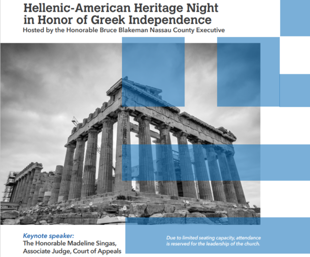 Την εθνική επέτειο της 25ης Μαρτίου θα τιμήσει ο νέος πρόεδρος του Nassau County στο Λονγκ Αϊλαντ, Bruce Blakeman με εορταστική εκδήλωση (Hellenic-American Heritage Night) που θα φιλοξενήσει την Τρίτη 29 Μαρτίου στην έδρα της κομητείας στη Μινεόλα.