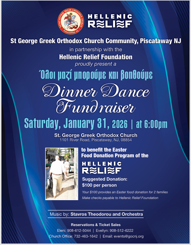 Looking ahead, the Hellenic Relief Foundation in partnership with the St. George Greek Orthodox Community of Piscataway, NJ are presenting a dinner dance to benefit the Easter food donation program. It will be held on January 31st at the church hall. For information and reservations, call (908) 612-5044 or (908) 512-6222.