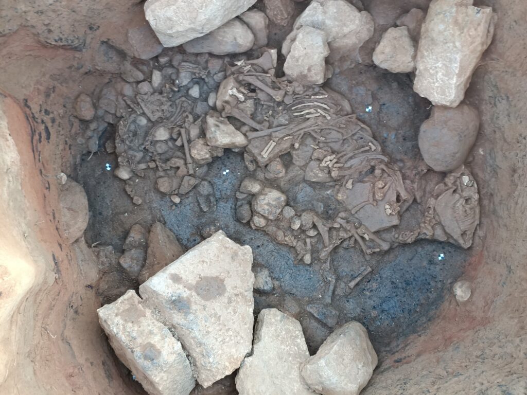 According to an announcement by the Ministry of Culture, the pithos had been placed in a pit dug into the clay soil of the stream’s southern bank. It stands 1.74 m high and features horizontal handles at the widest part of its body, as well as the characteristic rope-like relief decoration around the neck and the handles. Its mouth was sealed by a sturdy semicircular wall constructed of river pebbles, while two large stones with smaller slab-like stones between them formed a pseudo-doorway into the interior of the vessel, complete with jambs and a threshold. Inside, on a layer of sand and pebbles, the bones of two individuals were found, covered by large stones that occupied almost the entire available space.
