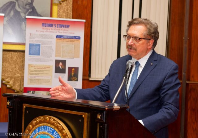 He was later joined by Professor Christos P. Ioannides, former Director of the Center for Byzantine and Modern Greek Studies at Queens College (CUNY), who presented and discussed the epic poem “The 9th of July 1821 in Nicosia” by Cyprus’ national poet, Vasilis Michaelides, delivered in the Cypriot dialect.