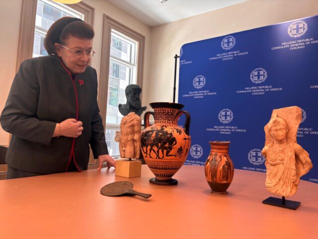 Η Υπουργός Πολιτισμού Λίνα Μενδώνη παρέλαβε, σε ειδική τελετή, στο Γενικό Προξενείο της Ελλάδας, στο Σικάγο, πέντε αρχαιότητες, που επαναπατρίζονται από τις Ηνωμένες Πολιτείες. Πρόκειται για δύο μελανόμορφα αγγεία (αμφορέα και όλπη) αττικών εργαστηρίων του 6ου αιώνα π.Χ. Ένα χάλκινο κάτοπτρο της Ύστερης Αρχαϊκής-Κλασικής περιόδου. Ένα ακέφαλο μαρμάρινο άγαλμα του Ερμή (1ος αι. π.Χ. – 1ος αι. μ.Χ.) και τμήμα αναγλύφου, με παράσταση της θεάς Αθηνάς, του 2ου αι. μ.Χ. Τα αντικείμενα είχαν αποκτηθεί στις δεκαετίες ’70 και ’80 από την οικογένεια Richard και Mary L. Gray. Τον Μάιο του 2025, τα τρία παιδιά τους, Harry, Jeniffer και Paul Gray, επικοινώνησαν με τις ελληνικές αρχές και προχώρησαν, από κοινού, στην οικειοθελή επιστροφή τους. Η διαδικασία ολοκληρώθηκε, χθες, με ευθύνη της Διεύθυνσης Τεκμηρίωσης και Προστασίας Πολιτιστικών Αγαθών του Υπουργείου Πολιτισμού.