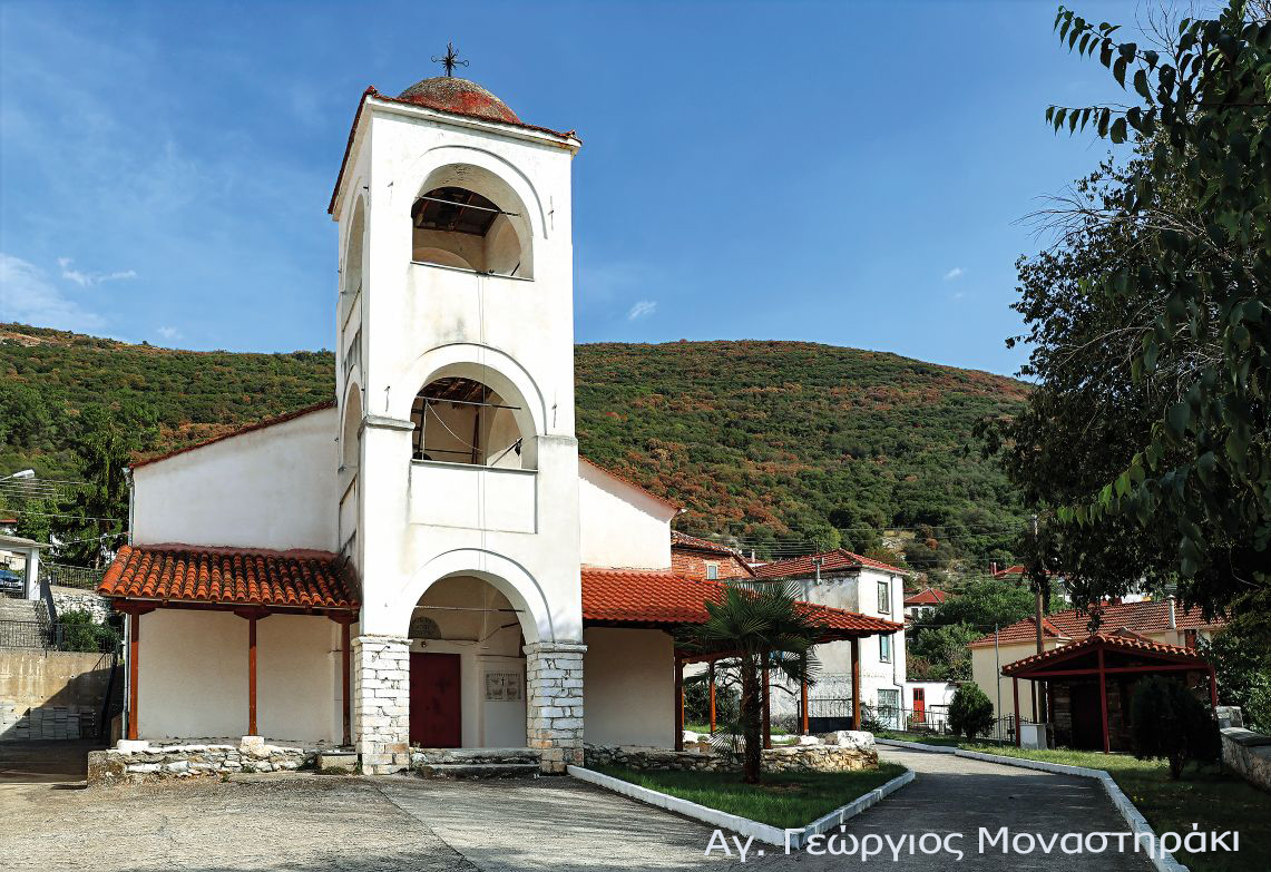 Σε απόσταση περίπου πέντε χιλιομέτρων βορειοανατολικά της Δράμας, νοτίως της πλατείας του Μοναστηρακίου, ο ναός του Αγίου Γεωργίου δεσπόζει διακριτικά στο τοπίο, σε υψόμετρο περίπου 300 μέτρων. Πρόκειται για τρίκλητη ξυλόστεγη βασιλική με γυναικωνίτη, χτισμένη το 1842, όπως μαρτυρεί ανάγλυφη επιγραφή.