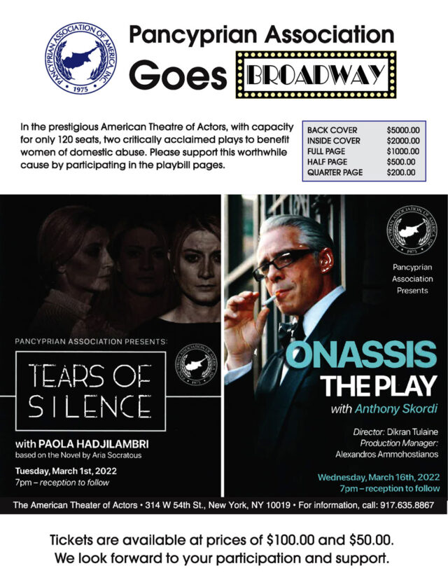 The second event is on Wednesday, March 16 at 7 pm, with Onassis, The Play, written and starring Anthony Skordi with production manager Alexandros Ammohostianos.