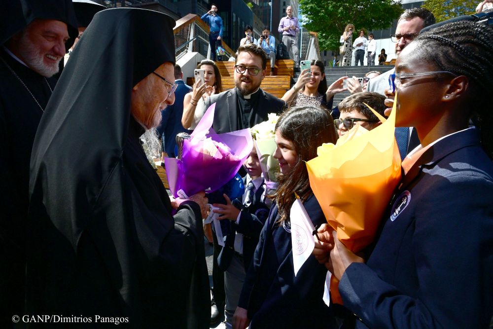 The children were students from the “Blue Ribbon” A. Fantis Parochial Day School of Saints Constantine and Helen in Brooklyn, accompanied by their teachers, parents, and parish priest Fr. Evagoras Constantinides. A small group of them presented His All-Holiness with bouquets of flowers.