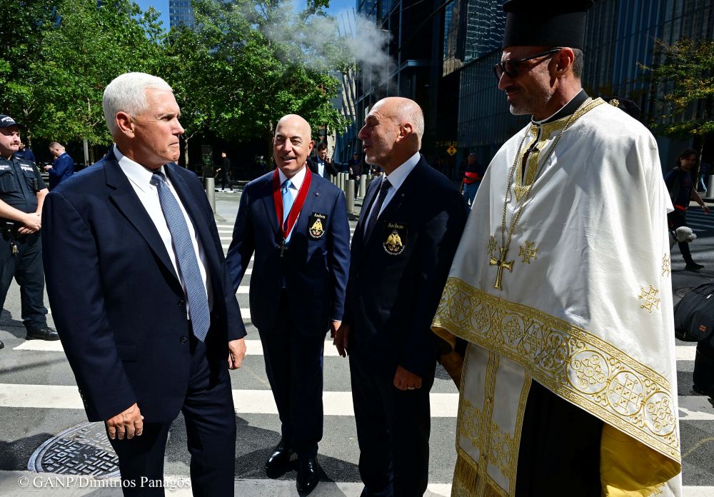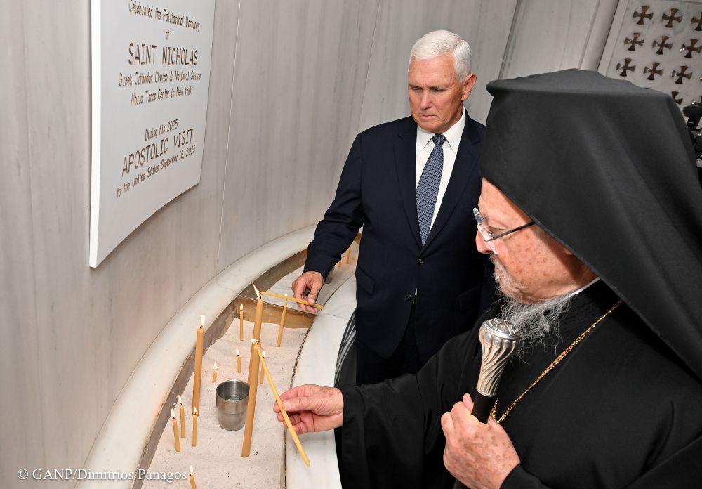 His All-Holiness then laid a wreath at the memorial honoring the victims of the September 11, 2001 terrorist attacks, located beside the main entrance of the marble-clad church. As he entered the Shrine, he was warmly greeted by Mike Pence, former Vice President of the United States.