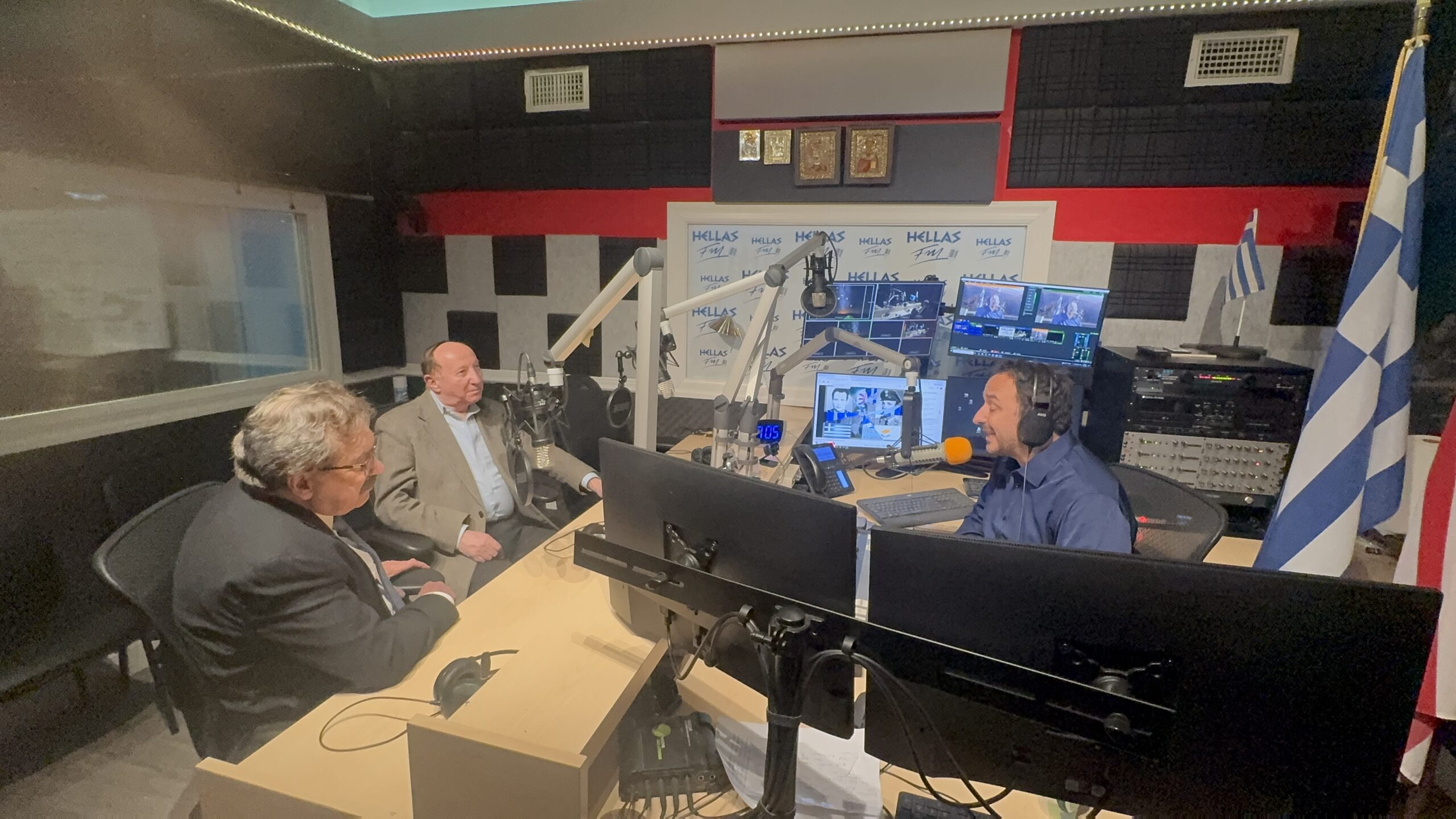 Parade Chairman Lou Katsos and PR Chair Dimitris Filios in conversation with Radiothon host Dimitris Filippidis during the live broadcast.
