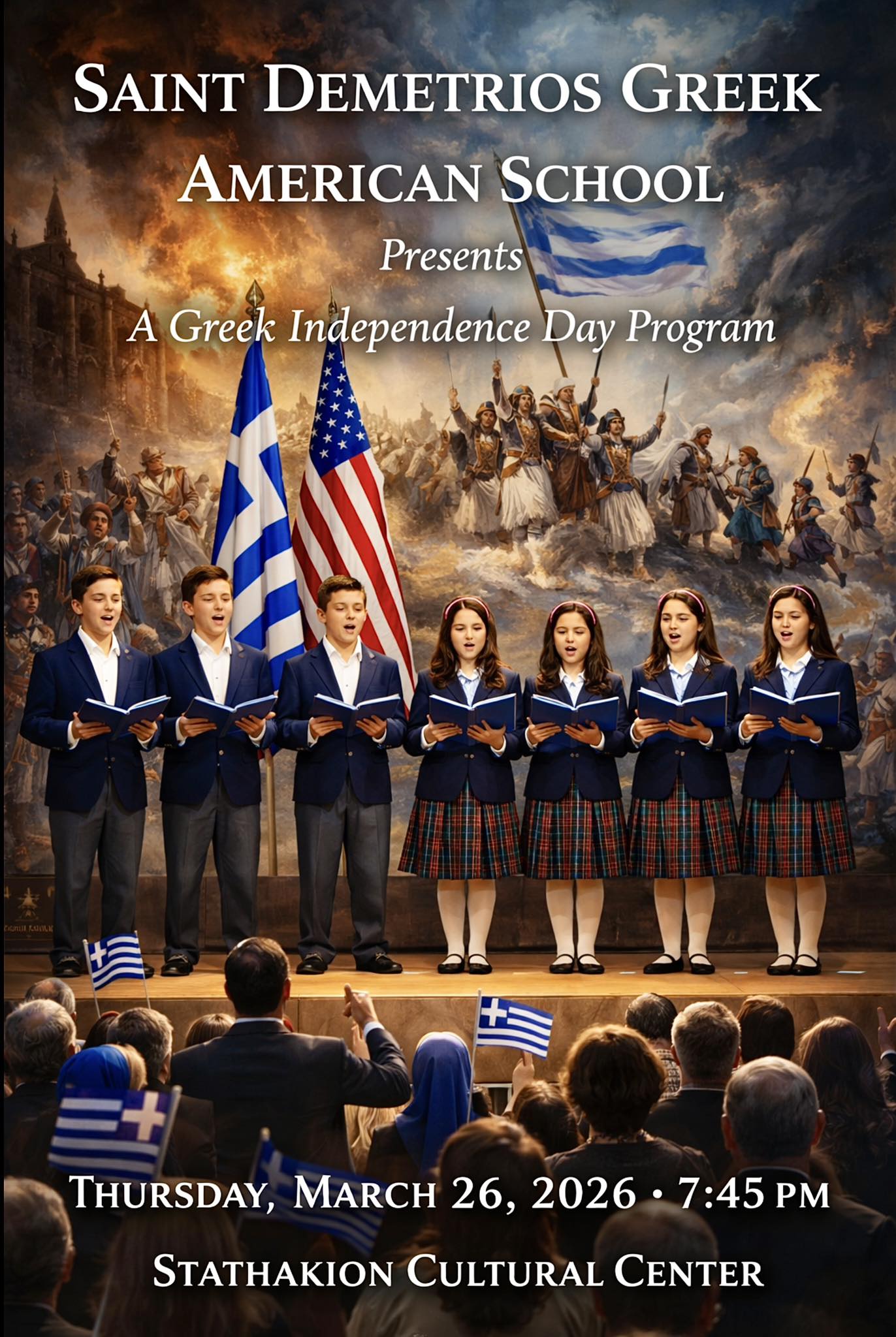 Inviting the community on behalf of the 2026 Parade Committee to attend and enjoy the performance of the students of Saint Demetrios, Chairman Katsos concludes by stressing that “together, these works form a unified offering, bridging faith and nation, poetry and history, memory and identity, and affirm that the Exodus of Messolonghi stands not only as an event, but as an eternal testament: that liberty, once awakened in the human soul, cannot be extinguished.