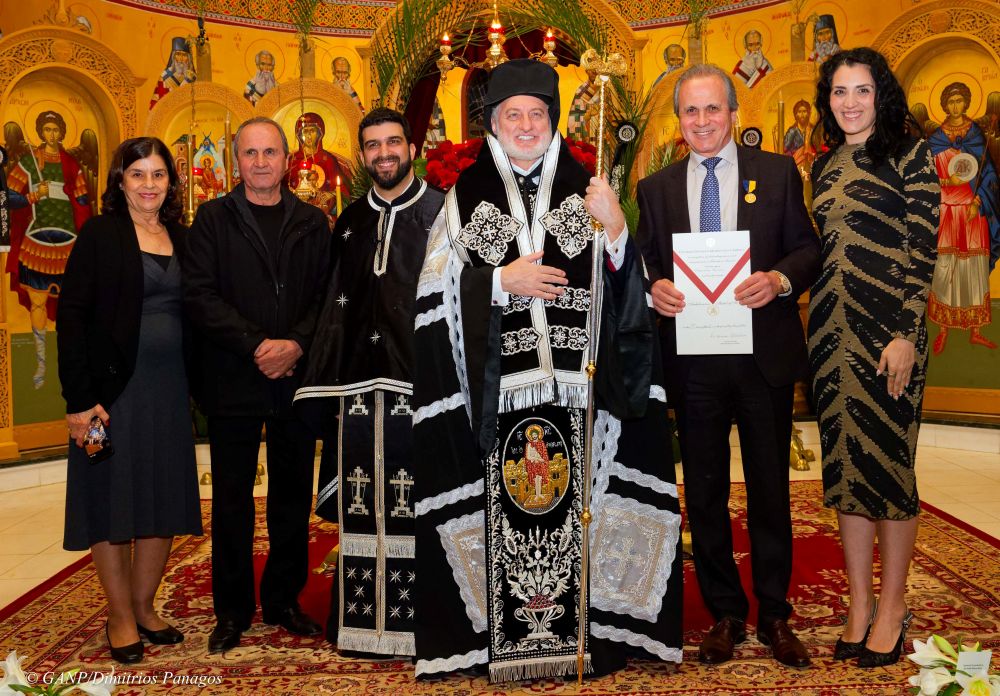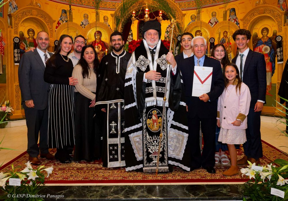 Τέλος, απένειμε το Μετάλλιο του Αποστόλου Παύλου, την ύψιστη τιμητική διάκριση της Ελληνικής Ορθόδοξης Αρχιεπισκοπής Αμερικής για λαϊκούς, σε δύο εκλεκτούς ενορίτες και δωρητές της κοινότητας, τον Ιωάννη Παράβαλο και τον Δημήτριο Πέρδιο.