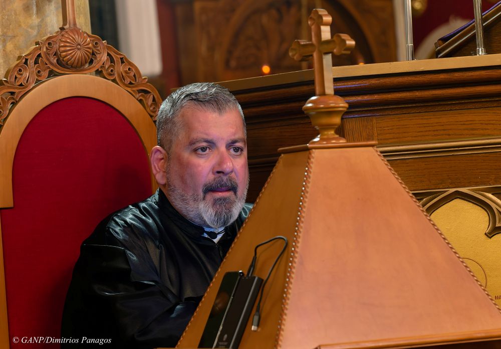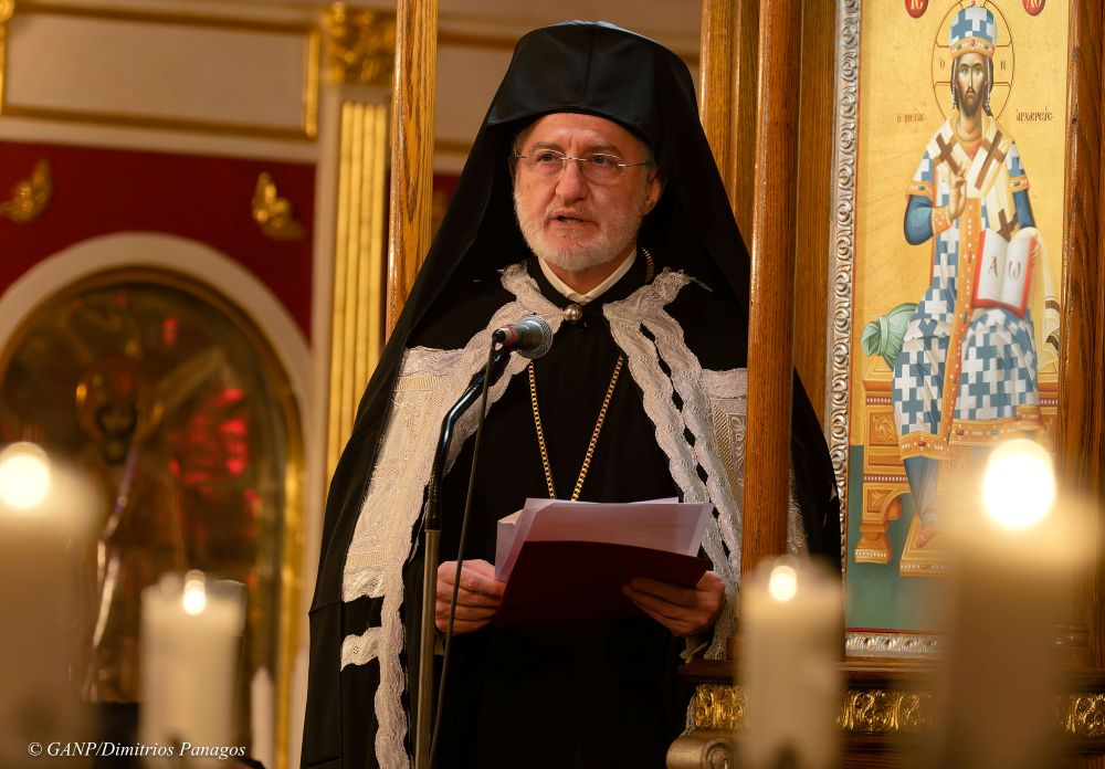 Τον Αρχιεπίσκοπο καλωσόρισε ο Αρχιμανδρίτης Δαμασκηνός Γκανάς, ιερατικώς προϊστάμενος της ιστορικής κοινότητας, εκφράζοντας «την πολλή αγάπη, τον σεβασμό και την εκτίμηση» των ενοριτών αλλά και τη  χαρά τους γιατί «συνεχίζετε μια θαυμάσια παράδοση τόσων ετών των προκατόχων σας». «Κοίμηση της Θεοτόκου και Τροπάριο της Κασσιανής χωρίς την παρουσία του Αρχιεπισκόπου δε σημαίνει τίποτα», είπε χαρακτηριστικά, για να λάβει την απάντηση ότι και «Τροπάριο της Κασσιανής χωρίς την Κοίμηση της Θεοτόκου δεν γίνεται»!