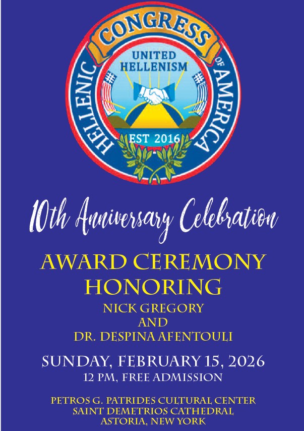 Το Ελληνικό Κογκρέσο Αμερικής (HECA) προσκαλεί την Ομογένεια στην εορταστική εκδήλωση για τη 10η επέτειό του και την Κοπή της παραδοσιακής Βασιλόπιτας, την Κυριακή 15 Φεβρουαρίου 2026, στις 12:00 το μεσημέρι, στο Πολιτιστικό Κέντρο “Πέτρος Πατρίδης” του Καθεδρικού Ναού Αγίου Δημητρίου Αστόριας (30-11 30th Dr, Astoria, NY 11102).