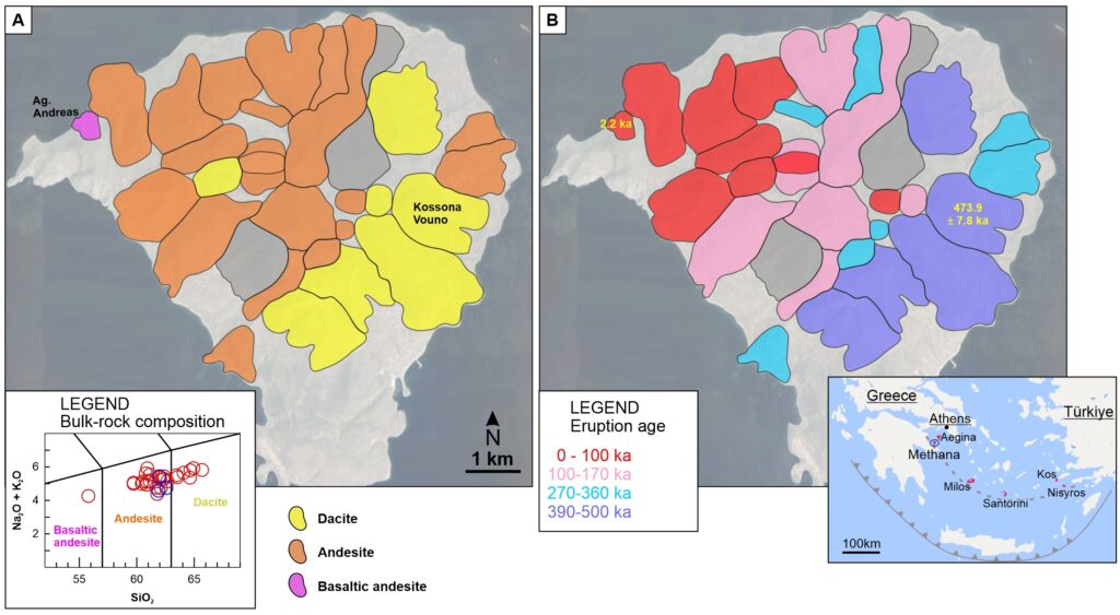 Οι αναλύσεις της ερευνητικής ομάδας καλύπτουν 31 εκρήξεις σε διάστημα περίπου 700.000 χρόνων. Για να κατανοήσουν την ιστορία του ηφαιστείου, οι ερευνητές πραγματοποίησαν επιτόπια δειγματοληψία συλλέγοντας υλικό από ροές λάβας, ηφαιστειακούς δόμους και κοιτάσματα ηφαιστειακής τέφρας. Επίσης, μελέτησαν περισσότερα από 1.250 μικρούς μαγματικούς κρυστάλλους που ονομάζονται ζιργκόν και οι οποίοι, όπως τονίζει ο κ. Ποπά, λειτουργούν σαν «μικροσκοπικές χρονοκάψουλες»: αναπτύσσονται στο μάγμα σε διαφορετικές χρονικές στιγμές και καταγράφουν τις συνθήκες και τον χρόνο σχηματισμού τους.