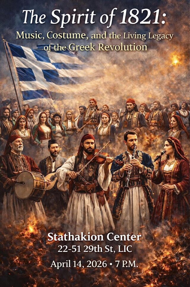 An extraordinary cultural event titled “The Spirit of 1821: Music, Costume, and the Living Legacy of the Greek Revolution” will take place on Tuesday, April 14, at 7:00 pm at the Stathakion Cultural Center in Astoria, the Parade Committee of the Federation of Hellenic Societies of Greater New York has announced.